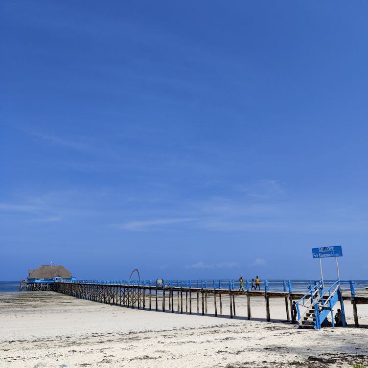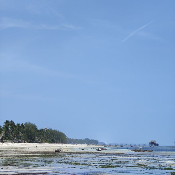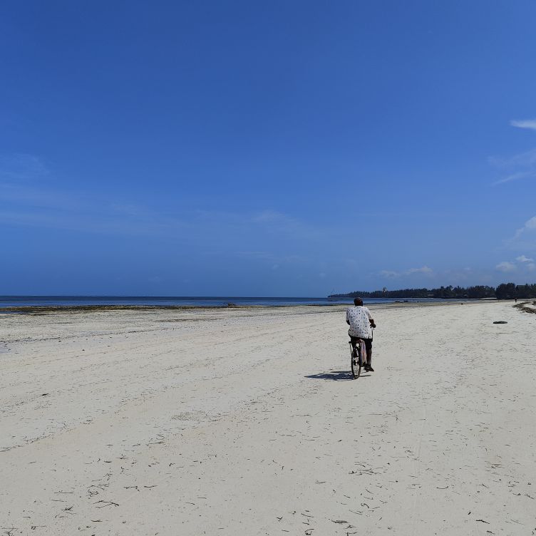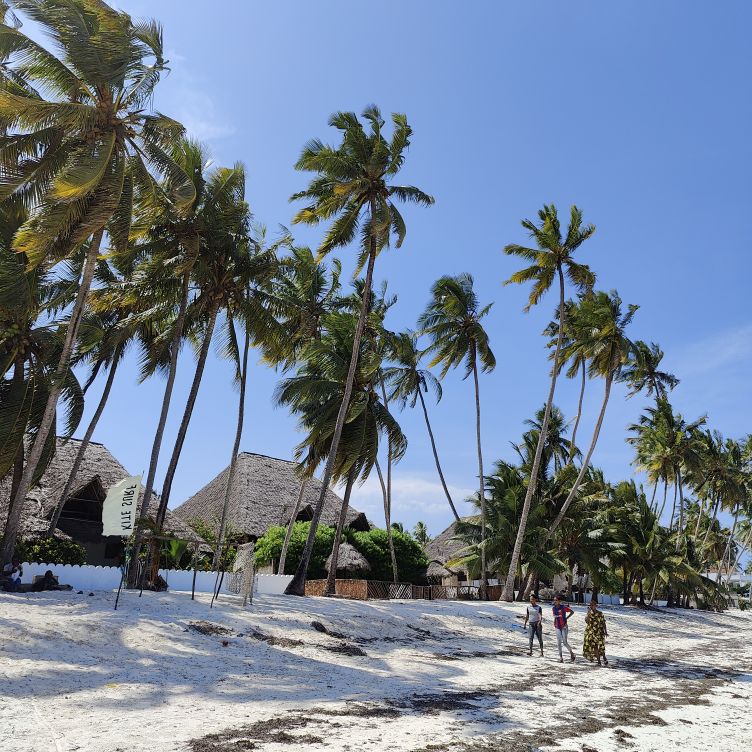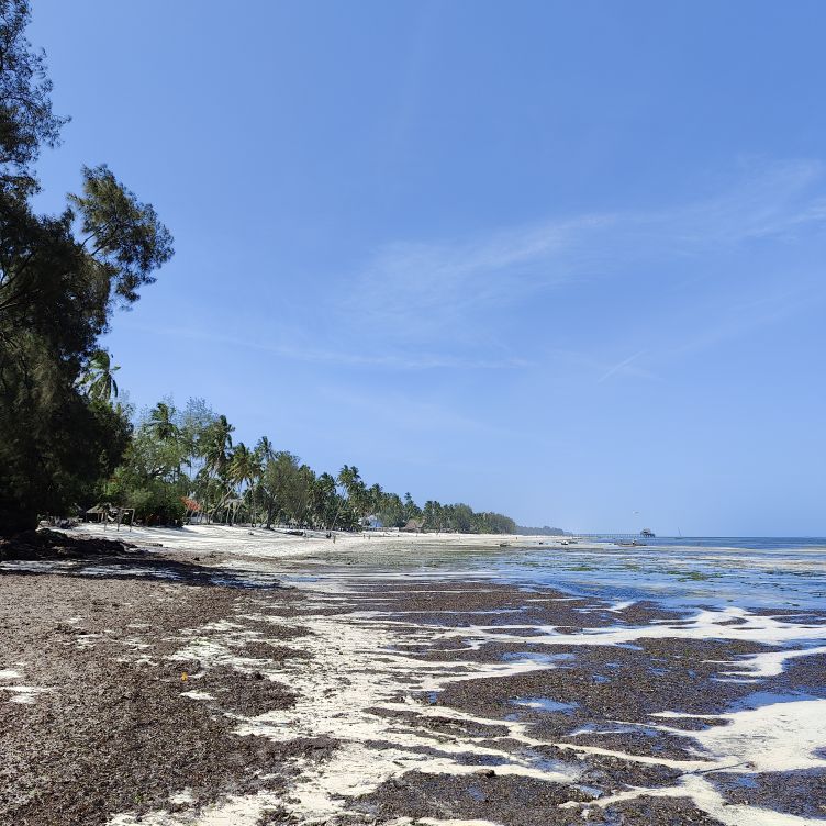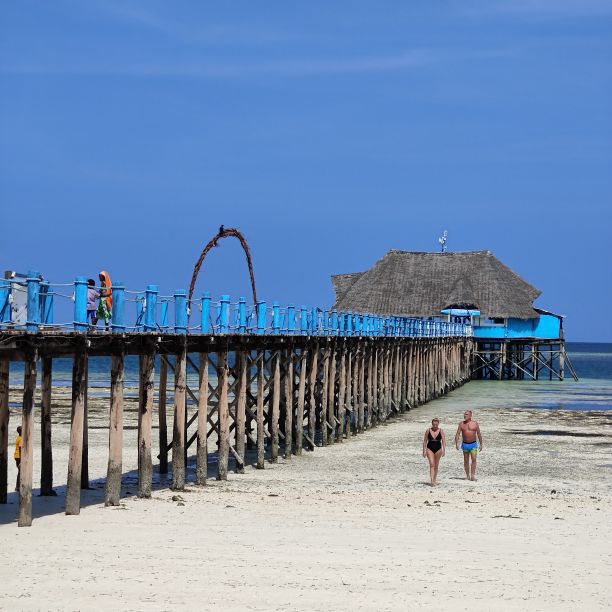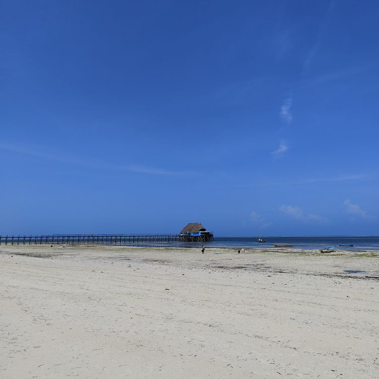 Am frühen Nachmittag machen wir uns zu Fuß auf den Weg ins Zentrum nach Kiwengwa. Unser Hotel liegt etwas außerhalb, auf dem Strandweg sind es etwa zwei Kilometer. Es ist Ebbe und es liegt viel Strand frei. Zwei Strandabschnitte müssen wir überwinden, in denen sich Unmengen an Seegras angesammelt haben. Wir gehen an Ferienresorts vorbei, hier ist es viel touristischer als in unserer kleinen Oase. Auch eine Brücke gibt es hinaus ins Wasser, an deren Ende sich ein Restaurant befindet. Wir gehen weiter und werden von den verschiedensten Verkäufern angesprochen. Wir lehnen den Kauf von Tüchern, Bändern, Hair Extensions und Bildern ab und schlendern weiter. Wir genießen das bunte Treiben am Strand. Als wir genug gesehen haben, kehren wir in ein kleines Strandrestaurant ein und essen eine Kleinigkeit. Dann marschieren wir zurück, die Sonne steht bereits tief und die Strandverkäufer lassen uns in Ruhe. Nach mehr als vier Stunden sind wir zurück und kühlen uns im Pool ab. Dann gehen wir Abendessen – es gibt Thunfisch mit Reis. Ein Cocktail muss auch noch sein – der Do Do Tamu ist ein Traum aus Cremigkeit und exotischem Geschmack.