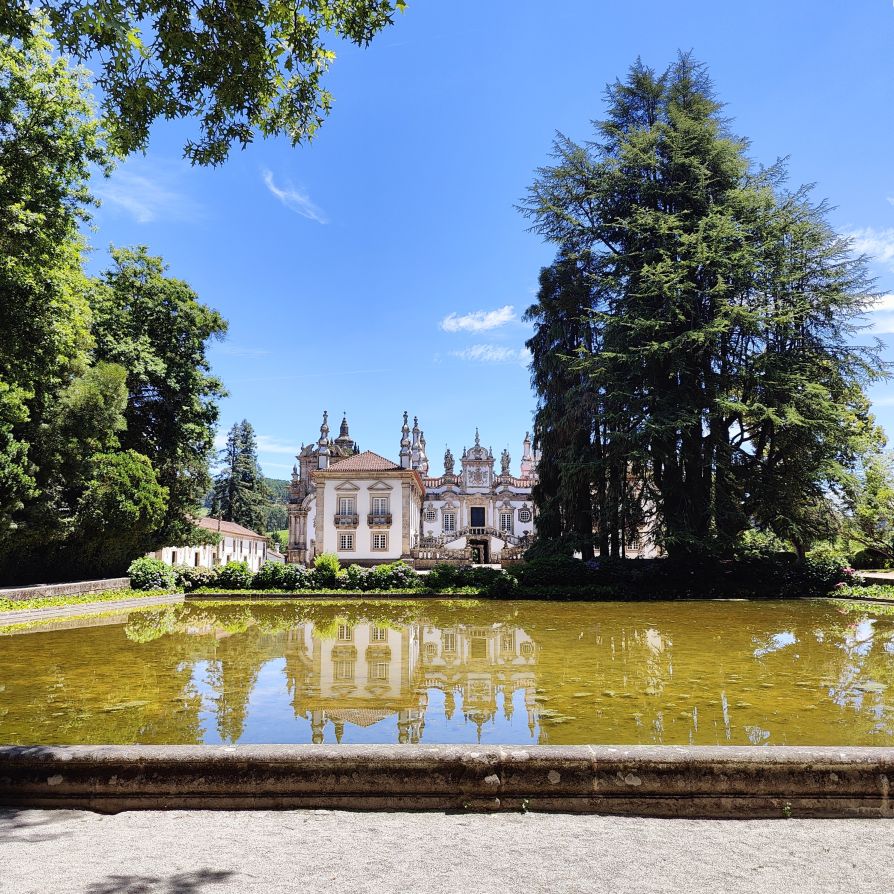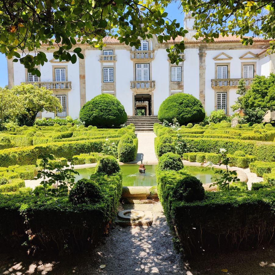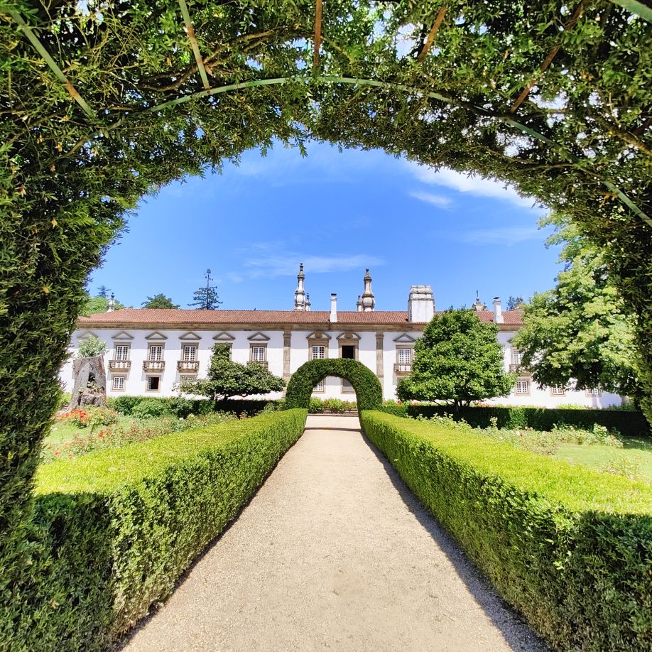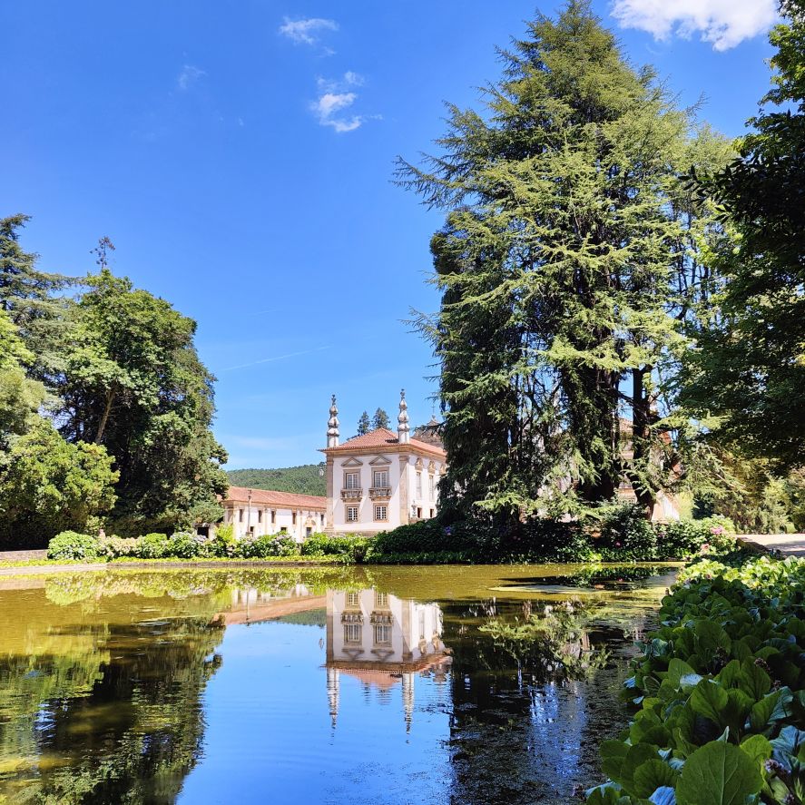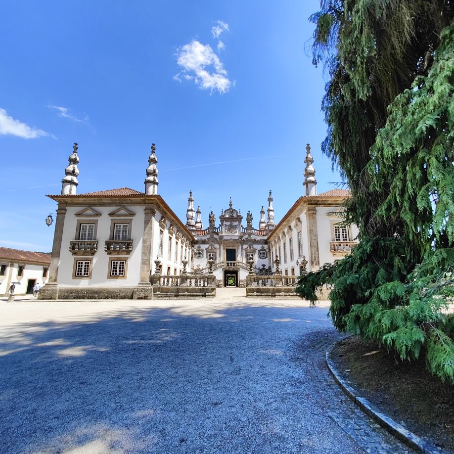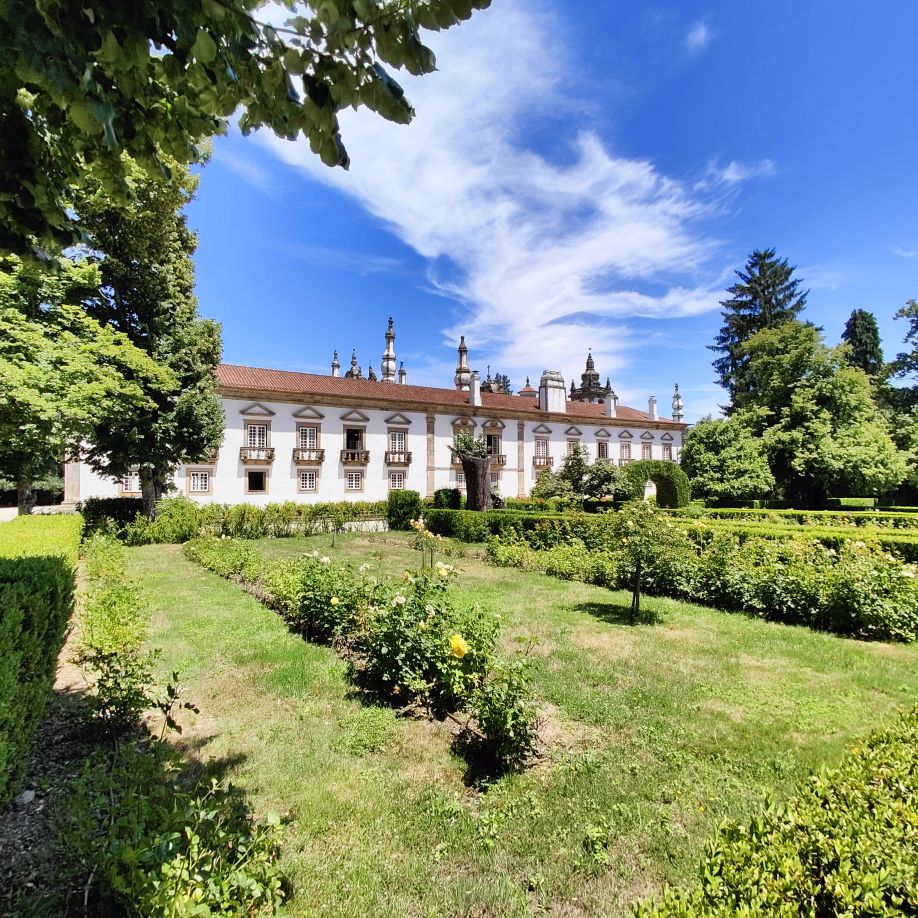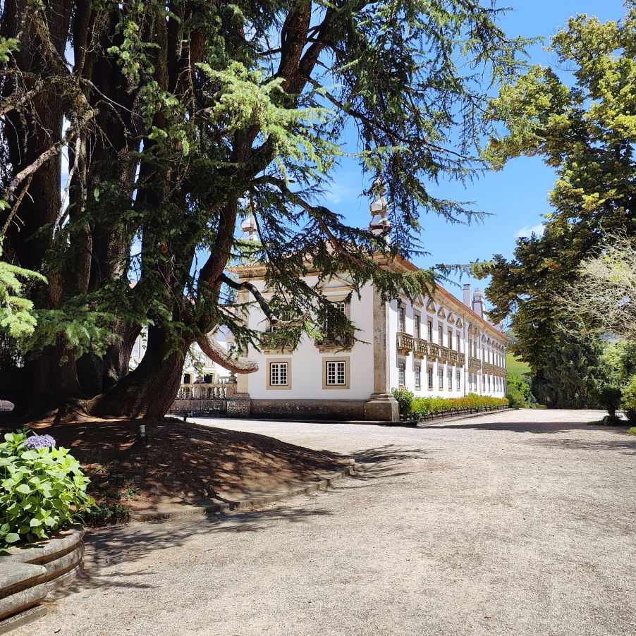Nach zehn Minuten Fahrt sind wir in Sabrosa und fahren zum gleichnamigen Aussichtspunkt, der uns mit einer Himmelsschaukel begrüßt. Weitere zehn Minuten entfernt finden wir eine zweite Schaukel auf dem Baloiço reino maravilhoso. Wir haben einen 360-Grad-Ausblick auf die Umgebung, denn der Aussichtpunkt befindet sich auf einem Hochplateau aus Granit. Weiter geht es nach Vila Real zum Casa de Mateus. Wir haben noch genügend Zeit bis zu unserer Tour und trinken ein kühles Sagres, dazu gibt es ein Sandwich, Pommes und Oliven. Dann betreten wir den beeindruckenden Park des Mateuspalasts. Auf 1488 datiert das älteste Dokument, das hier ein Landgut belegt. Der Besitzer der Ländereien ließ hier nach seiner Heirat 1541 ein erstes Herrenhaus errichten, das von den nachfolgenden Generationen mehrfach ausgebaut und verändert wurde. Der heutige Barock-Palast entstand um 1743. Der Architekt war Nicolau Nasoni, der Palastbesitzer der Adlige António José Botelho Mourão. Wir nehmen an einer geführten Tour durch die Räumlichkeiten teil und bewundern die stilvollen Räume. Dann besichtigen wir noch die Kapelle im Barockstil des 18. Jahrhunderts und drehen eine letzte Runde durch den Garten. Besonders beeindruckt uns die 150 Jahre alte Zeder.