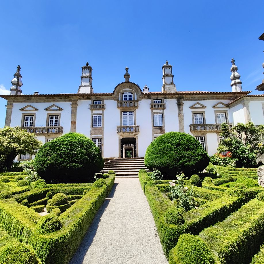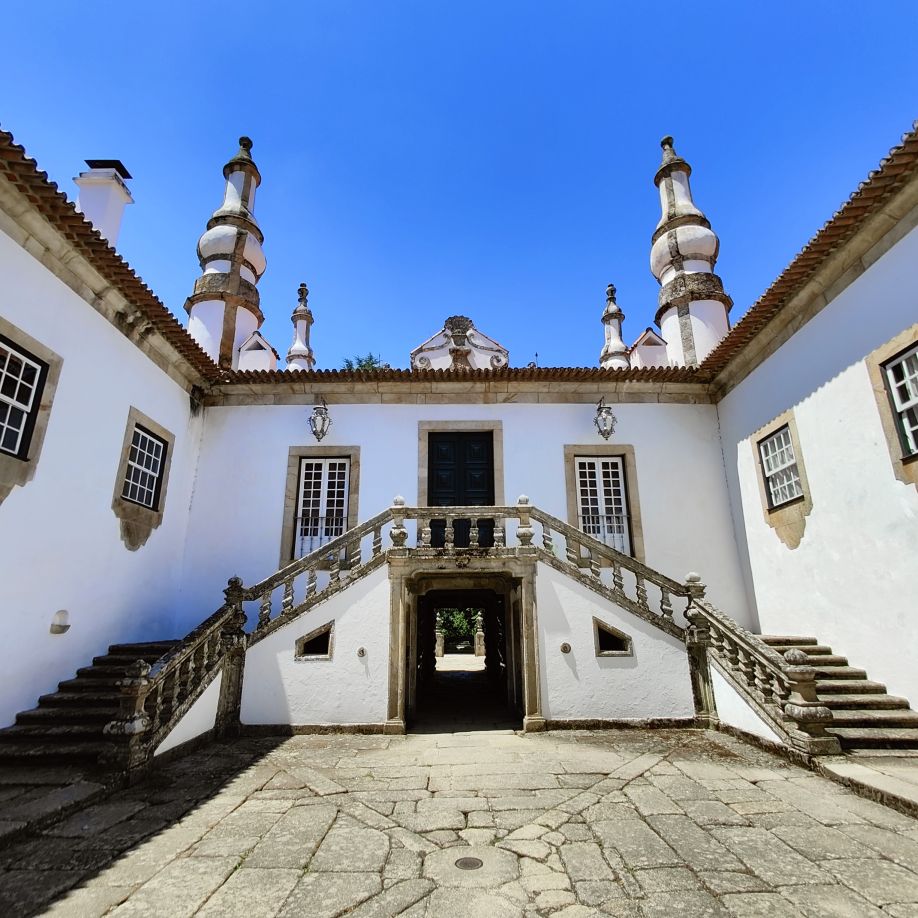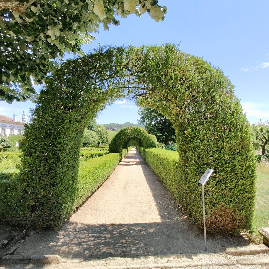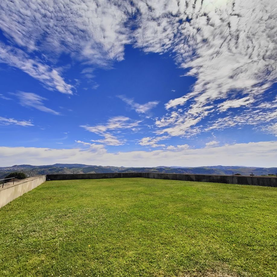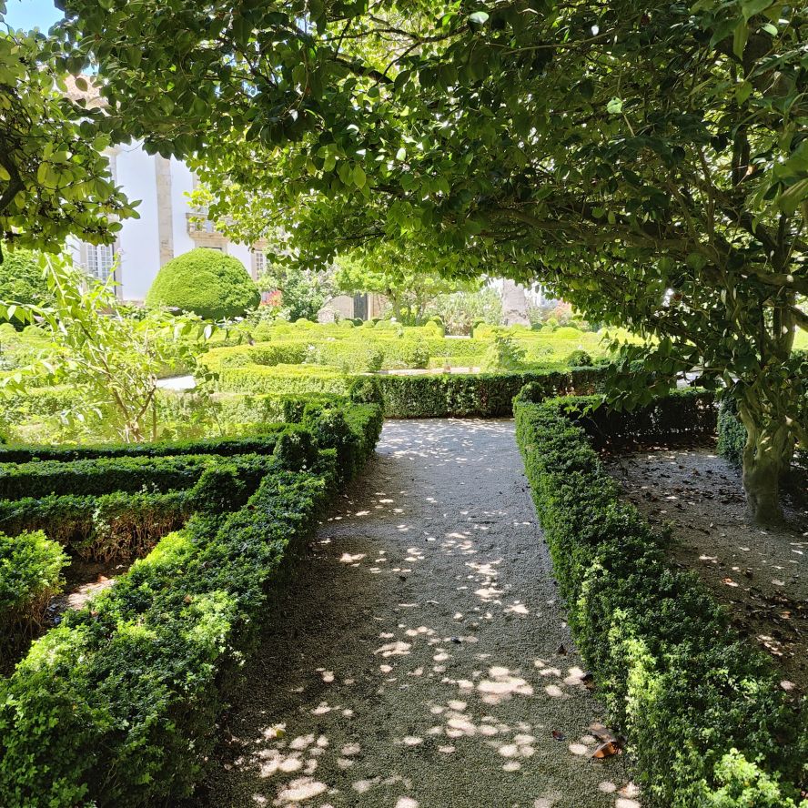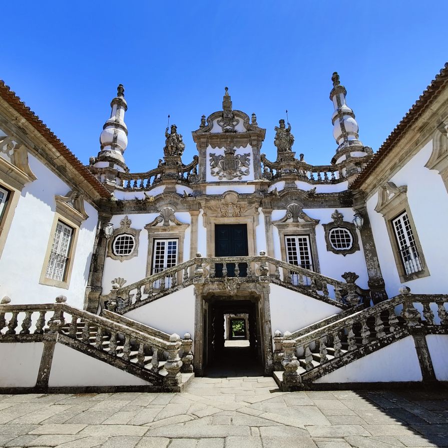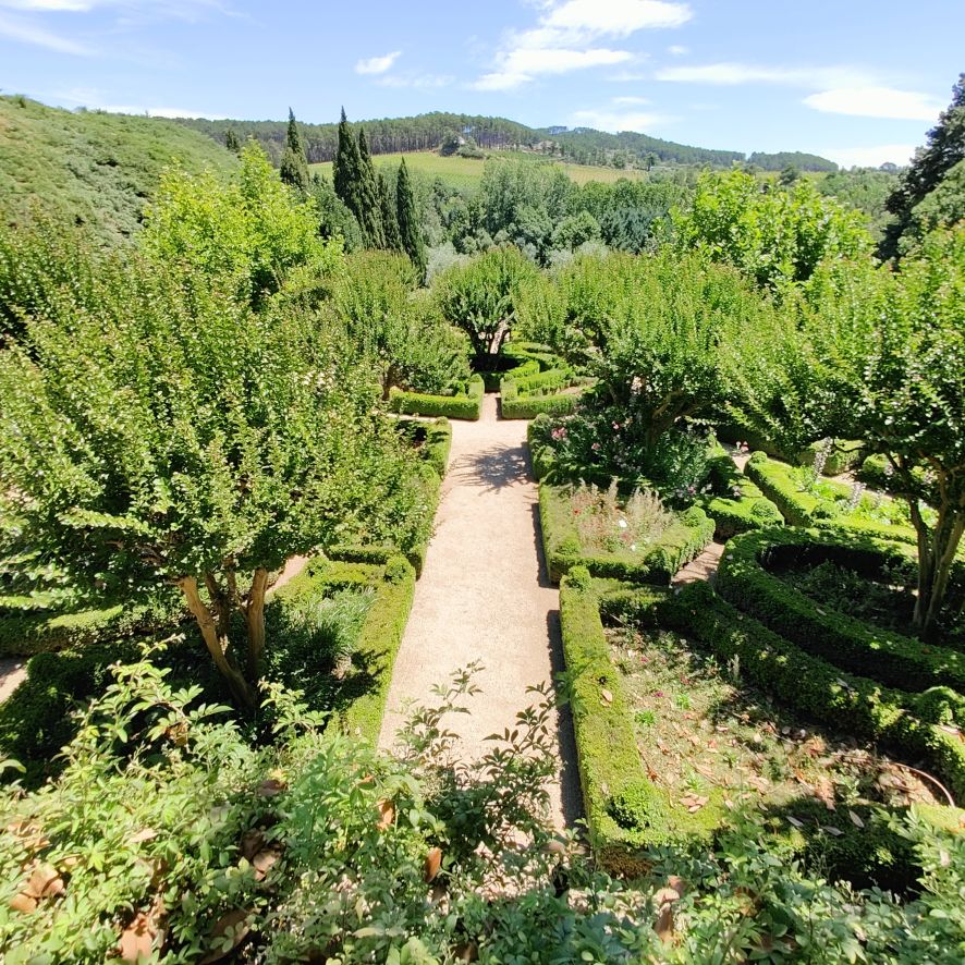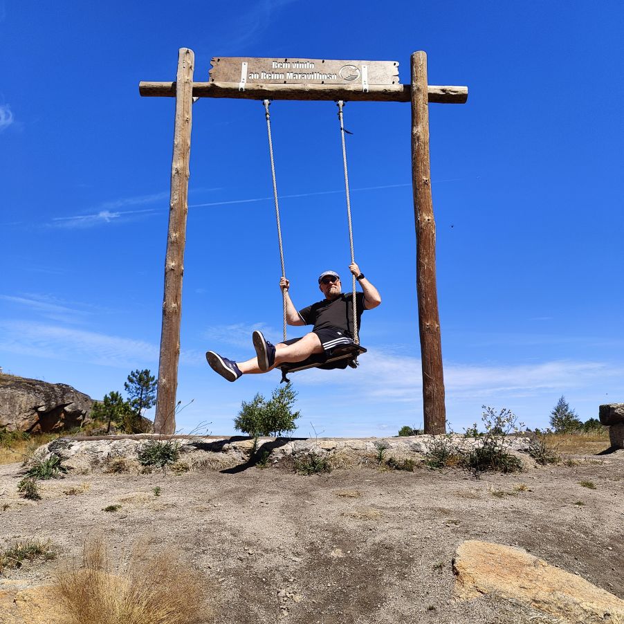 Nach zehn Minuten Fahrt sind wir in Sabrosa und fahren zum gleichnamigen Aussichtspunkt, der uns mit einer Himmelsschaukel begrüßt. Weitere zehn Minuten entfernt finden wir eine zweite Schaukel auf dem Baloiço reino maravilhoso. Wir haben einen 360-Grad-Ausblick auf die Umgebung, denn der Aussichtpunkt befindet sich auf einem Hochplateau aus Granit. Weiter geht es nach Vila Real zum Casa de Mateus. Wir haben noch genügend Zeit bis zu unserer Tour und trinken ein kühles Sagres, dazu gibt es ein Sandwich, Pommes und Oliven. Dann betreten wir den beeindruckenden Park des Mateuspalasts. Auf 1488 datiert das älteste Dokument, das hier ein Landgut belegt. Der Besitzer der Ländereien ließ hier nach seiner Heirat 1541 ein erstes Herrenhaus errichten, das von den nachfolgenden Generationen mehrfach ausgebaut und verändert wurde. Der heutige Barock-Palast entstand um 1743. Der Architekt war Nicolau Nasoni, der Palastbesitzer der Adlige António José Botelho Mourão. Wir nehmen an einer geführten Tour durch die Räumlichkeiten teil und bewundern die stilvollen Räume. Dann besichtigen wir noch die Kapelle im Barockstil des 18. Jahrhunderts und drehen eine letzte Runde durch den Garten. Besonders beeindruckt uns die 150 Jahre alte Zeder.