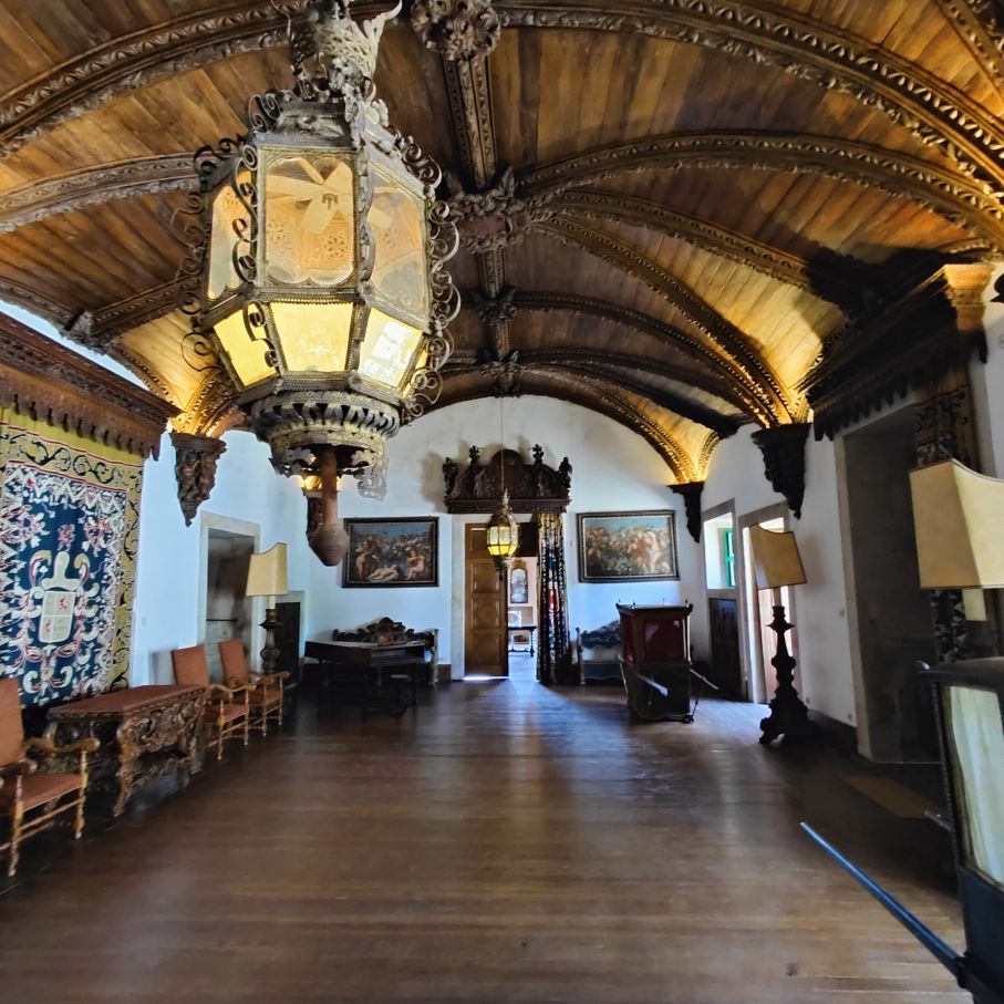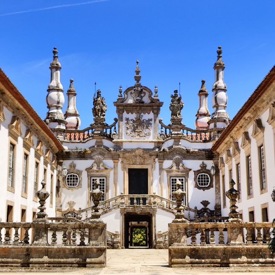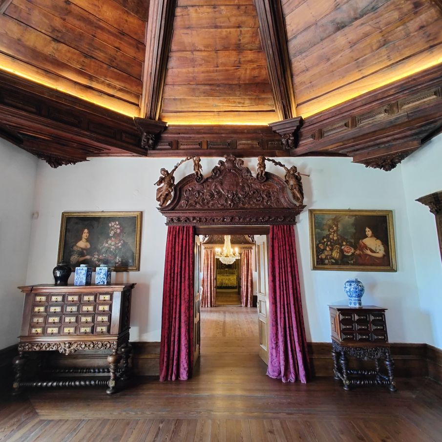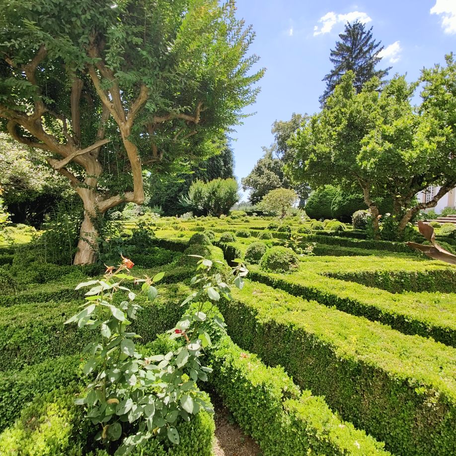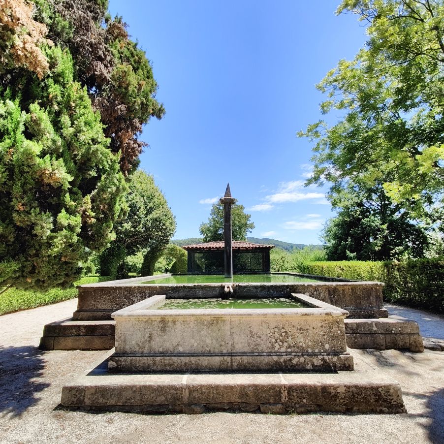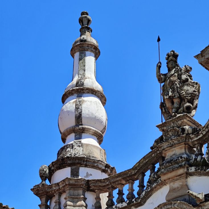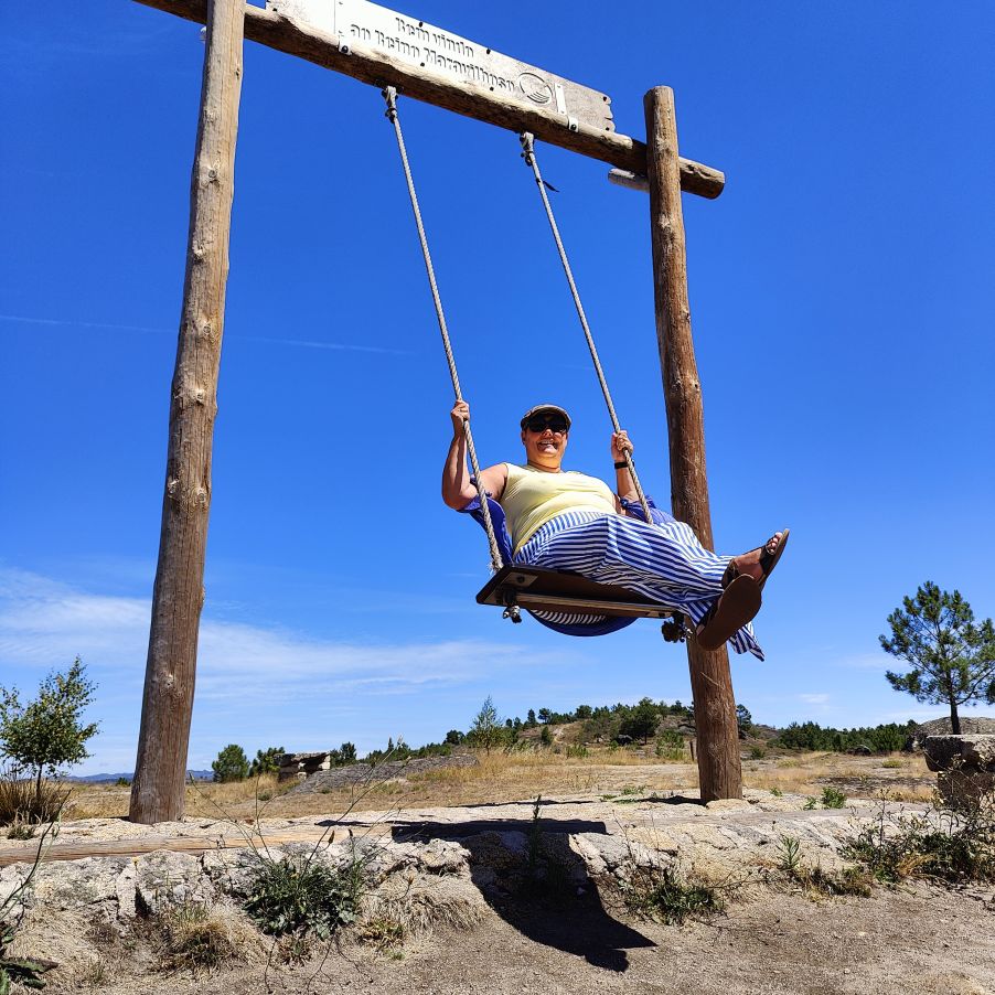 Nach zehn Minuten Fahrt sind wir in Sabrosa und fahren zum gleichnamigen Aussichtspunkt, der uns mit einer Himmelsschaukel begrüßt. Weitere zehn Minuten entfernt finden wir eine zweite Schaukel auf dem Baloiço reino maravilhoso. Wir haben einen 360-Grad-Ausblick auf die Umgebung, denn der Aussichtpunkt befindet sich auf einem Hochplateau aus Granit. Weiter geht es nach Vila Real zum Casa de Mateus. Wir haben noch genügend Zeit bis zu unserer Tour und trinken ein kühles Sagres, dazu gibt es ein Sandwich, Pommes und Oliven. Dann betreten wir den beeindruckenden Park des Mateuspalasts. Auf 1488 datiert das älteste Dokument, das hier ein Landgut belegt. Der Besitzer der Ländereien ließ hier nach seiner Heirat 1541 ein erstes Herrenhaus errichten, das von den nachfolgenden Generationen mehrfach ausgebaut und verändert wurde. Der heutige Barock-Palast entstand um 1743. Der Architekt war Nicolau Nasoni, der Palastbesitzer der Adlige António José Botelho Mourão. Wir nehmen an einer geführten Tour durch die Räumlichkeiten teil und bewundern die stilvollen Räume. Dann besichtigen wir noch die Kapelle im Barockstil des 18. Jahrhunderts und drehen eine letzte Runde durch den Garten. Besonders beeindruckt uns die 150 Jahre alte Zeder.